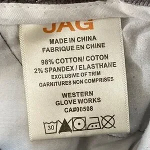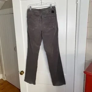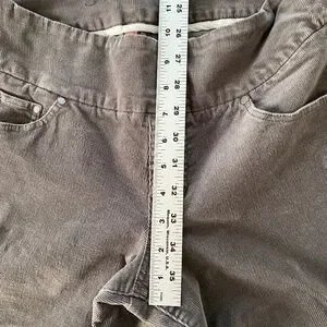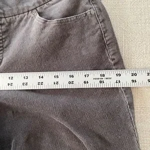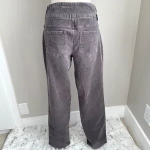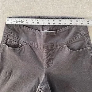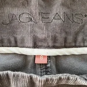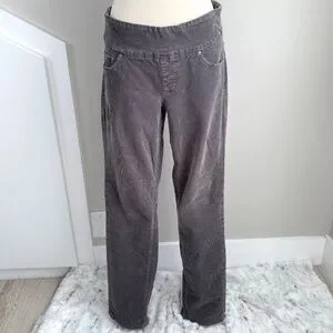 Super soft, comfy pull on style - JAG high-rise, straight leg corduroy pants in charcoal gray, women's size 8. Mostly cotton with 2% spandex for stretch. Good used condition, no rips, tears or stains. Light signs of wear at knees, see photos.