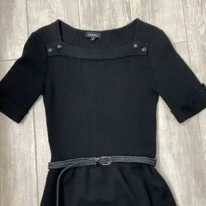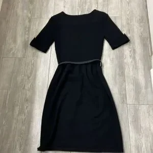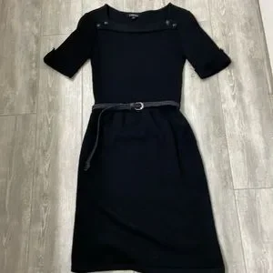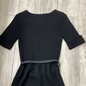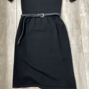 This is a gorgeous sweater dress by Caroll. It is size one and was only worn once. It virtually has no signs of wear. It is very flattering and is 50% acrylic 50% wool. The belt is also a very nice touch to add flattering Details. Armpit to armpit it measures 14 1/2 inches but still has tons of stretch. The waist measures unstretched 13 inches. And then shoulder to hem measures approximately 37 inches. Gorgeous dress for many seasons.