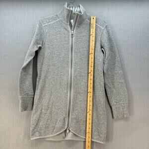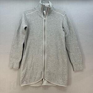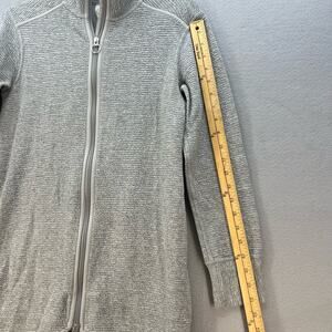 Lululemon Women's Sweatshirt Jacket. In the color gray heather. Tagged size 2. This Lululemon On Repeat Core Light has a textured pattern, a high collar, pockets, full zip, oversized fit and extra length. In preowned condition with minimal signs of wear.