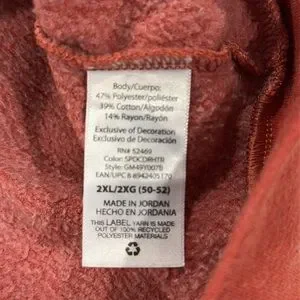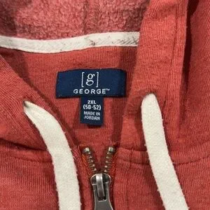 Men’s lightweight zip up hoodie. Orange with blue and whites stripes of sleeves, white drawstring. Minor pilling on front is barely noticeable.