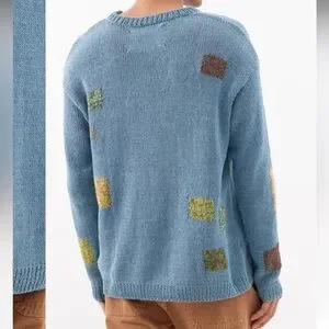 Hand-knit in India from organic cotton, Story mfg.'s blue patchwork Spinning sweater is coloured using dyes from natural indigo and kaduka plants.