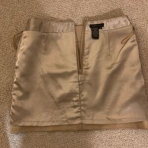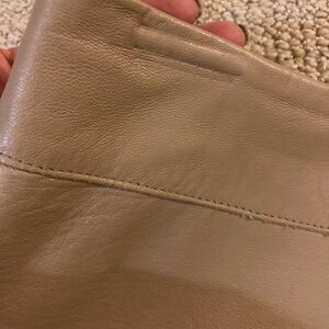 Tan, lined 100% leather mini skirt lovingly worn (about ten times over past ten years). Minor impression marks are nearly invisible (on waistband where hanger clip not padded). To sweeten the deal, this sexy skirt comes with Italian made scarf (in photo folded in half; 64” long) and Sanctuary brand (four button) cotton, rayon vest. Pet-free, smoke-free home. Usually ship same day.