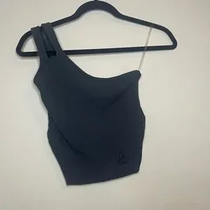 This is a ribbed tank for women in a size x-small. This tank is very unique with no sleeves and only straps! There are 2 straps on the right side with 2 side slits. This tank comprises 54% Cotton, 38% Polyester, and 8% Spandex.
