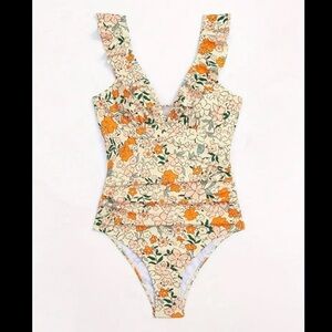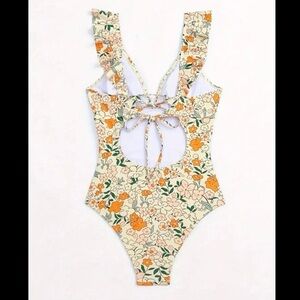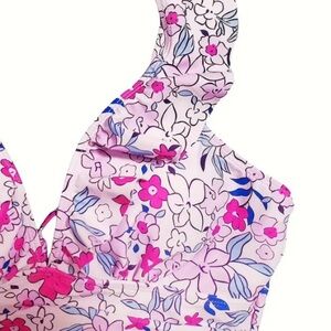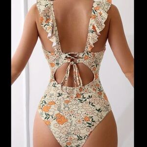 🩷🩷🩷 THIS LISTING IS FOR PINK FLORAL SWIMSUIT ONLY🩷🩷🩷 Striking One Piece Swimsuits with Ruffled V-Neck and open hole back. Because this ties in back, it makes this adjustable for various breast sizes.
