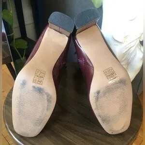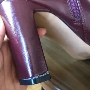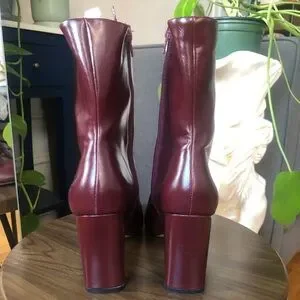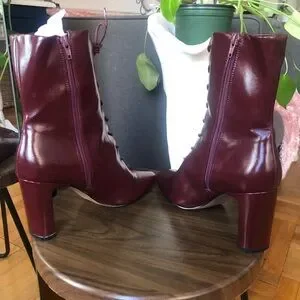 These burgundy leather look sassy boots are a must! Side zipper closure with front lace tie, chunky 3.8 inch heel in new condition as they were worn once indoors. Minor imperfection on heel as pictured but Does not take away from the quality or performance of the actual boot. No box