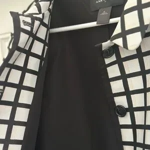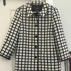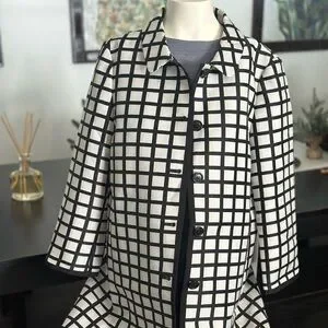 Cream and Black pattern. Rayon material. Satin lined. Pockets on each side. Approx 36” in length. Worn once. Perfect condition. Can wear for business or going out. Smoke free home.