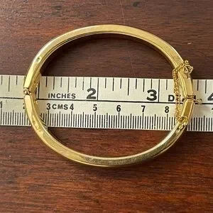 This is an absolutely gorgeous gold tone metal oval hinged bangle bracelet. Its inner diameter is 2 3/8 inches and it will best fit wrist size 7 inches. Has a safety chain for more security. In excellent vintage condition.