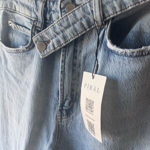 CROSS BELT JEANS from PIRAL high rise blue. Sooo cute just a little too long on me and I have a short torso so the zipper looks a little too long as I’m shorter 5’4 with longer legs vs torso. Soooo cute though. Size M