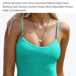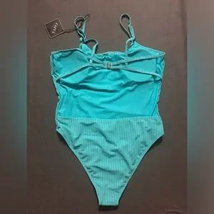 Ribbed type texture. Open back. Adjustable straps. Removable padded cups. Hook in back. Scoop neck. High cut.