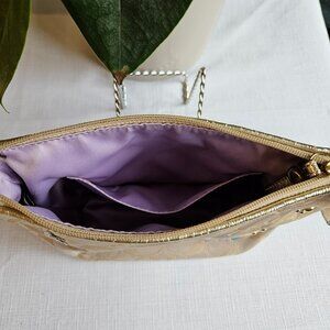 Coach Handbag With Matching Mirror Khaki Gold. Gold handle, piping and hang tag. Lavendar color and one pocket inside. 6-inch handle drop with no missing studs or sequins. Mirror 3 1/2", bag is 6"x9"x3". Great used condition. $158 retail..