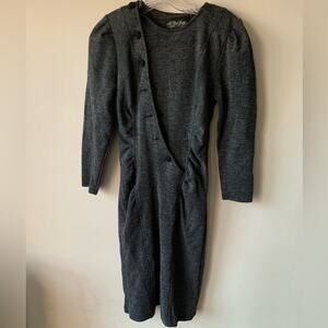Well done vintage All That Jazz 1980s power mini dress in a soft textured knit. This style features shoulder pads, asymmetrical buttons & long sleeves. Style with pants or a sheer satin skirt beneath for a fun layering moment.