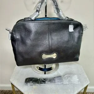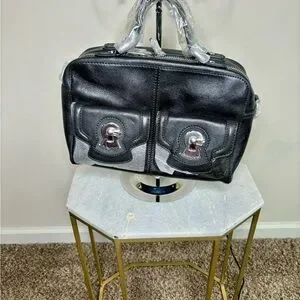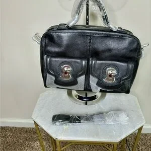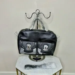 Firenze Stylish black Italian leather handbag with crossbody strap. Features silver lock accents. Includes a detachable strap.