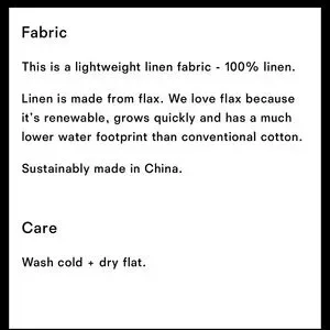 This is a lightweight Linen is made from flax. We love flax because it's renewable, grows quickly and has a much lower water footprint than conventional cotton.