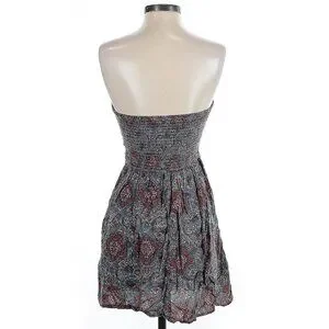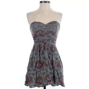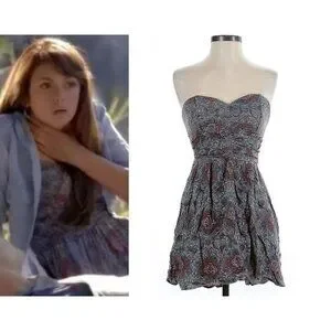 Hi, you are purchasing a dress by Band of Gypsies. It is strapless with a sweetheart neckline and allover cream/blue/burgundy allover paisley print. This dress is a size small and in excellent condition. Elena Gilbert (Nina Dobrev) wore an identical dress in The Vampire Diaries episode “True Lies” (season 5, episode 2). Please look at my other listing – I am selling more screen-accurate clothing.
