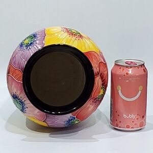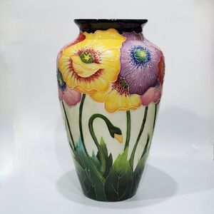 This is larger almost 12" vase in this series and oh how gorgeous she is!!! Eyecandy Bold Bright poppies jump out for the paintings is done in a #Cloisonné like style that makes this thick heavy high quality ceramic vase just POP! Zoom in to see bold black, reds, yellow, pink, purple, green, blue....... Dramatic black & vivid vibrant colors with detailed raised boarder defining each cell of lusciously pigmented colors! You will love ❤️ this I promise! My pics don't do her justice. Absolutely No chips cracks and in great used condition.