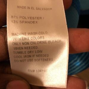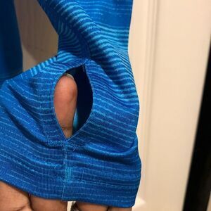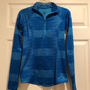 Striped blue, long sleeve active top, jacket pullover for running or aerobic activity. Half zip with thumb holes on cuffs and high collar. Pit to pit 16in, length 24in, arm length 23in.