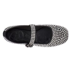 A playful twist on the classic ballet flat. Adorned with dazzling rhinestones and equipped with a stylish functional strap, this shoe is poised to become your go-to statement piece of the season, adding a touch of flair to any ensemble.
