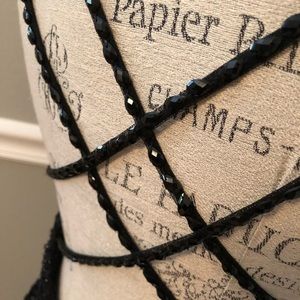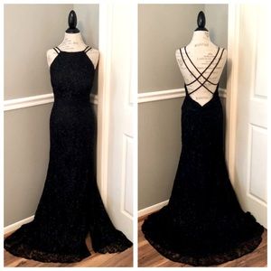 Gorgeous! Full Length Lined Sleeveless Maxi Black Lace Detailed Formal Evening Gown. Padded Bra, Halter Style With Beaded Straps. Long Flowing Skirt, Leg Slit 30”, Slight Train. It’s Exquisite! ✨🌹✨ Note: Last Pic For Style Only. This Gown Is Black. ☺️
