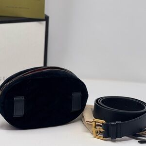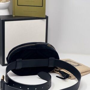 This is from the Gucci's Marmont collection, this oval belt bag is crafted in luxe black velvet, featuring the collection signature chevron quilting and finishing with antiqued gold-tone Running 'GG' hardware on the front. Belt size 85/34. Waist measures 29"-37"