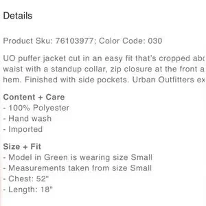 Urban Outfitters UO Cropped Taryn Puffer Coat - M