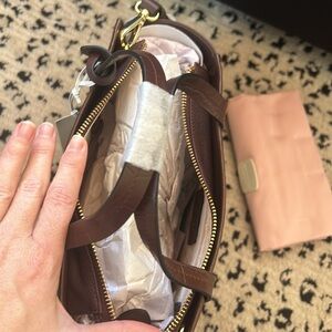 NWT! Brown Radley London bag complete with dust bag!! Small Downtown model. Can be worn as a handbag or has a detachable cross body strap. 9.1"W x 9.1" H x 3.9" D; strap drop 22.4"