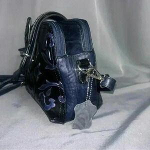 Madi Claire Abigale Tooled Leather Crossbody Handbag Black Ink Purple Embossed