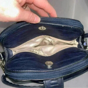 Madi Claire (MC) makes this real leather tooled/embossed leather cross body purse in a "black ink" (black with a brushed purple color) with silver hardware. Brand new, retailed for $98, Snap flap closure.
