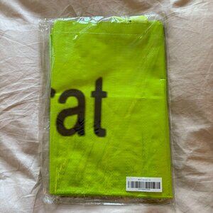 custom brat green tote bag with with printed "brat" on front and back. woven "CHARLI XCX" top handles.