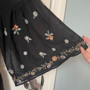 Excellent condition Anfisa dress from Maeve for Anthropologie. Sheer chiffon material with floral embroidery that has subtle gold threads woven in. Fully lined for modesty. Smocked, super stretchy waist. 37” shoulder to hem. 14” flat waist. 18” armpit to armpit.