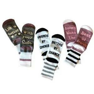 Set of three pairs of crew length socks featuring phrases celebrating sisterhood. Grey with pink toes: Life is better … with your sister. White with black toes: Sisters by chance … Friends by choice. Pink with white toes: Sisters make the … best of friends. Writing is dimensional non skid grip material.