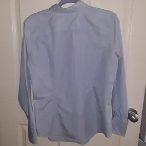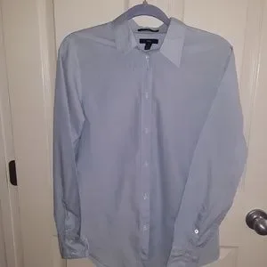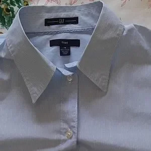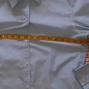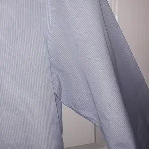100% cotton and it's a very light cotton, light blue white white stripe shirt. There are lots of darts and princess seaming which produce a nice fit rather than a body silhouette. A close up pic shows the subdued stripe and also two small imperfections on one sleeve. Otherwise in excellent shape.