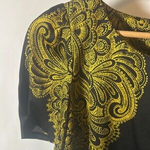 Vintage Juicy Couture black and gold paisley blouse with intricate gold paisley design on a sleek black. This top looks expensive like silk without being so precious. The sleeve hits midway between the shoulder and elbow and has a cute, slight puff at the shoulder for a touch of femininity on an otherwise modern structured look.