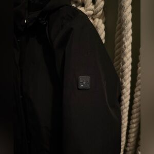 Still love this coat and it is in overall very good condition! The only noticeable wear is on the metal square logo on the right arm - I scratched it a few times (see photo). Otherwise a clean and fully functional coat. Kept me warm in MN winters. A bit too tight for my liking now. It is still a true black color with no fading. I took two photos due to lighting - darker one more representative of color, lighter one better for details.