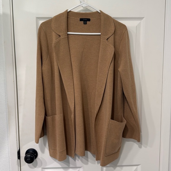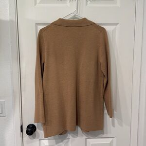 Stylish sweater blazer is in excellent condition, worn a couple of times and in camel color. 35% cotton, 30% Merino wool, 35% polyester.