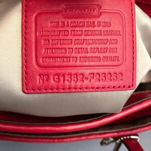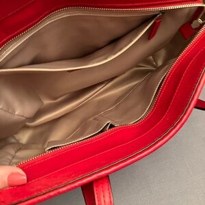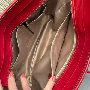 Gorgeous! Gift worthy! Gathered leather, double handle, top zipper and satin lining. Bag Width 14" across the bottom and about 17" across the top, height about 11", Depth 4". Ripe tomato red with silver hardware. No dust bag but will include the round Coach script signature hangtag charm. No stains, marks or odors. EUC