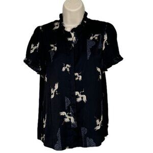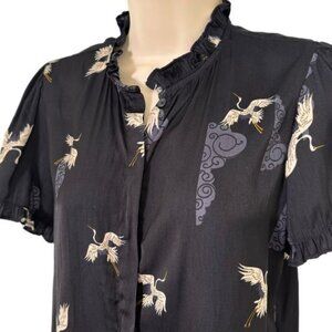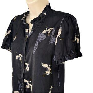 T Tahari Crane Print Black Ruffle Short Sleeve Blouse Small
