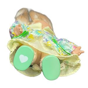 Carolyne comes loose without her original box. She is blonde with a light yellow bow in her twisted ponytail above her head that goes to the left. Her eyes are blue and her skin tone is a light complexion. She is wearing a light yellow collared floral white top with blue, purple, and yellow flowers and a white skirt. The outfit is removable and can be opened and closed with a hook and latch closure. She is wearing light cyan blue plastic buckle shoes and plastic white socks that are connected to the shoes. On the bottom of her left shoe is a white heart. The shoes are not removable from the doll's body.