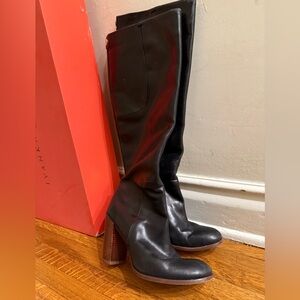 Super cute black knee high leather boots with gold detail on back of leg. Pull on style with very soft and supple leather and stacked brown block heel by Ivanka Trump and purchased at Bloomingdale’s. Really comfortable and stylish. Gently used.