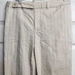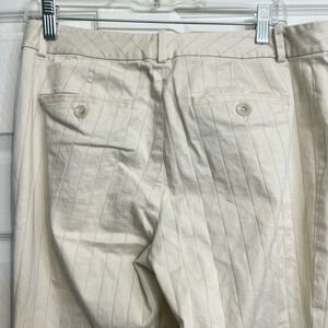 Beautiful cream colored, pin stripe pant. See first photo for fit. Pants are in excellent condition just need to be ironed. Pants have cuff at bottom hem line.