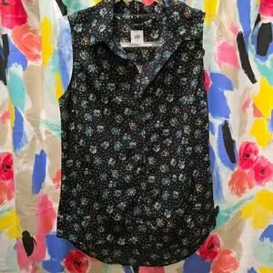 Cabi black sleeveless collared button down top size small. Cute ditsy floral print, high-low cut, lightweight polyester material.