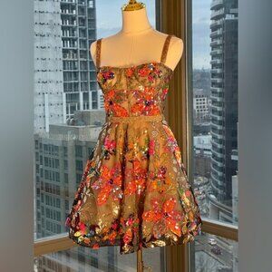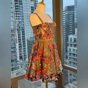 Bronx and Banco "Mademoiselle" floral sequin and beaded mini dress features a bustier-style bodice and a full A-line skirt. Intricate floral sequined embellishments in rich orange red pink and gold hues, as well as crystal details add sparkle to this classic silhouette.