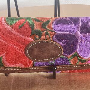 JL Brand Mexican Floral Design Embroidered Leather Snap Shut Wallet / Clutch Red Green Lilac....Great Handmade Wallet with Tons of Space....Beautiful Colors and the Design is Impeccable...Wait for the compliments....Brand New with Tags....