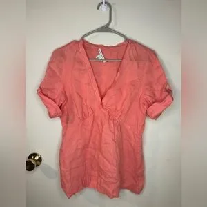 Women’s size medium, pink/salmon, V-neck hundred percent linen short-sleeve blouse. Tag has become loose at one end as pictured.