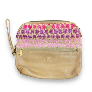 Fossil leather tan and pink multicolor Preston fold over wristlet. Features a soft pebbles leather, pink and violet Pom Pom on outer top flap, good tone hardware, main zipper closure, inner zip compartment with 6 credit card slots, magnetic Fold over closure, detachable wrist strap. Excellent condition.