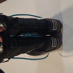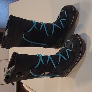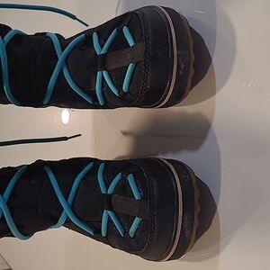 LIKE NEW SOREL Glacy Explorer Black Boots with Toggle Faux Fur and Blue Laces