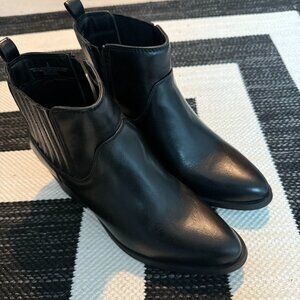 Faux-leather ankle-length Western bootie with pointed toe and a 2 1/4" inch heel. Very comfy, and only worn once. Great condition!