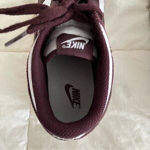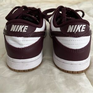 Nike Dunk Low shoes in white and burgundy. Real and synthetic leather, rubber outsole. In excellent used condition with minimal signs of wear. Only worn once or twice.