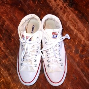 Worn twice! Basically brand new. Women's white Converse; mid ankle height. Minor staining on the back of the right heel that can probably be washed out. New laces. Smoke free home. Excellent used condition.