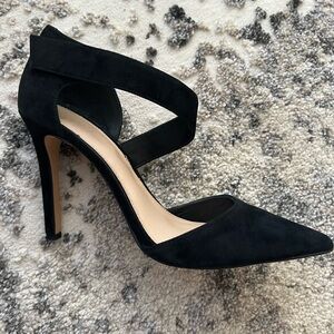Vince Camuto Black suede cross strap pointed toe heels.