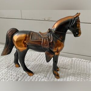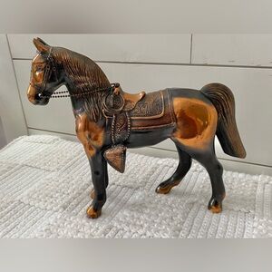 Beautiful antique cast pot metal horse statue. Wearing an ornate saddle harness. 10” tall, 12” long and 3” wide. Heavy piece weighing 2.38 pounds. Stamped U.S.A on the bottom as shown. Smoke free home.